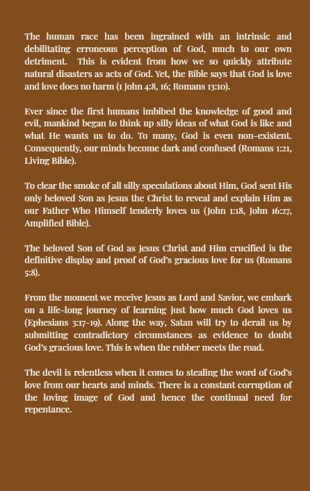 The human race has been ingrained with an intrinsic and debilitating erroneous perception of God, much to our own detriment. This is evident from how we so quickly attribute natural disasters as acts of God. Yet, the Bible says that God is love and love does no harm (1 John 4:8, 16; Romans 13:10).
