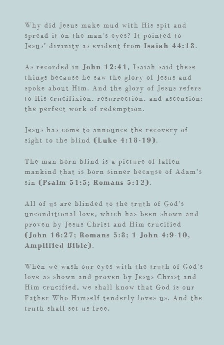 Why did Jesus make mud with His spit and spread it on the man’s eyes? It pointed to Jesus’ divinity as evident from Isaiah 44:18.